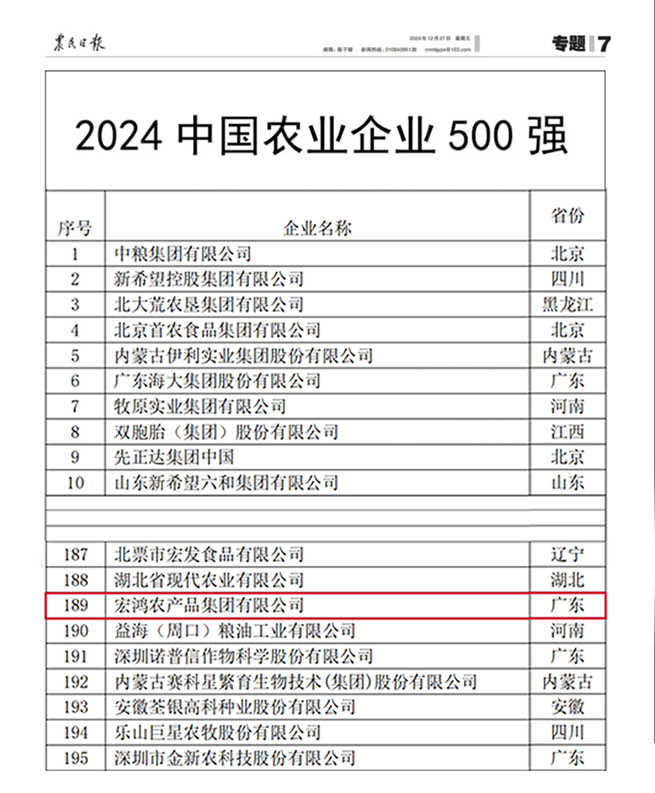 近日,农民日报社经过严格的信息汇集、审核以及专家评议等程序,正式发布了“2024年中国农业企业500强”榜单。宏鸿集团以出色的业绩表现,再次脱颖而出,位列第189位,较去年上升67位,排名大幅提升。中国农业企业500强榜单汇聚了粮油、畜牧、奶业、水产、食品等多个农业相关领域的头部企业,是衡量农业企业综合实力的风向标,深受各界认可。自参选以来,宏鸿集团连续四年上榜,彰显了其在食材配送行业的深厚底蕴和强劲实力。